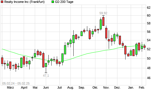 Mit dem Rücksetzer auf 52,03 EUR hat die Realty Income-Aktie am 04.02.2025 die 200-Tage-Linie nach unten gekreuzt.