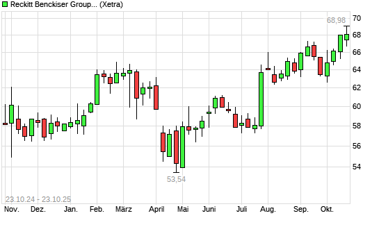 Mit dem Anstieg auf 67,92 EUR hat die Reckitt Benckiser-Aktie (ISIN GB00B24CGK77) am 22.10.2025 ein neues 12-Monats-Hoch erreicht und damit den Kurs vom 20.10.2025 eingestellt.