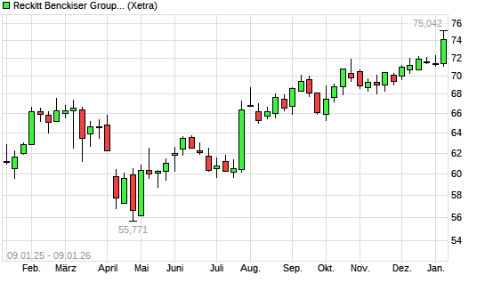 Mit dem Anstieg auf 70,86 EUR hat die Reckitt Benckiser-Aktie (ISIN GB00B24CGK77) am 08.01.2026 ein neues 12-Monats-Hoch erreicht und damit den Kurs vom 06.01.2026 eingestellt.