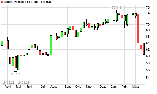 Mit dem Rücksetzer auf 61,42 EUR hat die Reckitt Benckiser-Aktie (ISIN GB00BSZBP530) am 18.03.2026 ein neues 6-Monats-Tief erreicht und damit den Kurs vom 13.03.2026 eingestellt.