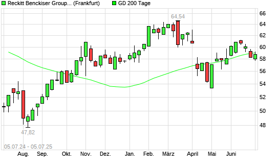 Mit dem Rücksetzer auf 58,74 EUR hat die Reckitt Benckiser-Aktie am 04.07.2025 die 200-Tage-Linie nach unten gekreuzt.