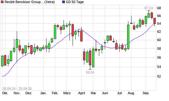 Mit dem Rücksetzer auf 63,58 EUR hat die Reckitt Benckiser-Aktie am 24.09.2025 die 50-Tage-Linie nach unten gekreuzt.