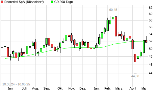 Mit dem Rücksetzer auf 52,10 EUR hat die Recordati-Aktie am 09.05.2025 die 200-Tage-Linie nach unten gekreuzt.
