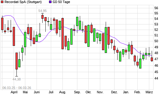 Mit dem Rücksetzer auf 47,62 EUR hat die Recordati-Aktie am 05.03.2026 die 50-Tage-Linie nach unten gekreuzt.