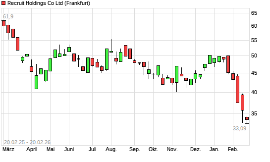 Mit dem Rücksetzer auf 33,96 EUR hat die Recruit Holdings-Aktie (ISIN JP3970300004) am 19.02.2026 ein neues 12-Monats-Tief erreicht und damit den Kurs vom 18.02.2026 eingestellt.