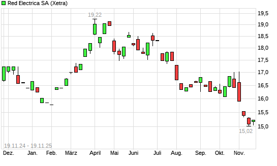 Mit dem Rücksetzer auf 14,97 EUR hat die Red Eléctrica-Aktie (ISIN ES0173093024) am 18.11.2025 ein neues 12-Monats-Tief erreicht und damit den Kurs vom 17.11.2025 eingestellt.