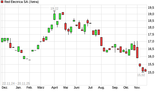 Mit dem Rücksetzer auf 14,64 EUR hat die Red Eléctrica-Aktie (ISIN ES0173093024) am 21.11.2025 ein neues 12-Monats-Tief erreicht und damit den Kurs vom 20.11.2025 eingestellt.