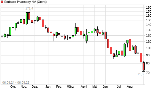 Mit dem Rücksetzer auf 72,70 EUR hat die Redcare Pharmacy (ex Shop Apotheke)-Aktie (ISIN NL0012044747) am 05.09.2025 ein neues 12-Monats-Tief erreicht und damit den Kurs vom 03.09.2025 eingestellt.