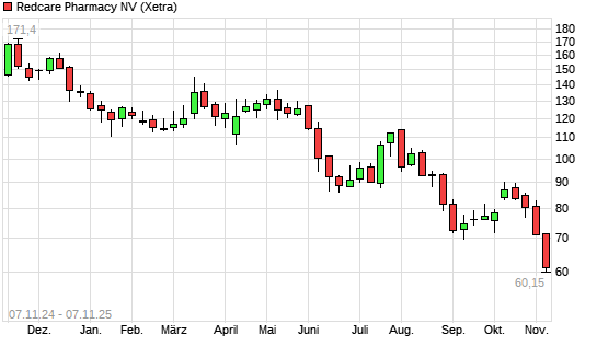 Mit dem Rücksetzer auf 62,10 EUR hat die Redcare Pharmacy (ex Shop Apotheke)-Aktie (ISIN NL0012044747) am 06.11.2025 ein neues 12-Monats-Tief erreicht und damit den Kurs vom 05.11.2025 eingestellt.
