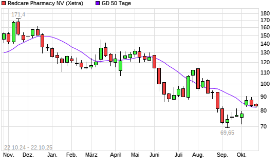Mit dem Rücksetzer auf 82,05 EUR hat die Redcare Pharmacy (ex Shop Apotheke)-Aktie am 21.10.2025 die 50-Tage-Linie nach unten gekreuzt.