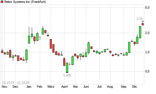 Mit dem Anstieg auf 2,65 EUR hat die Rekor Systems-Aktie (ISIN US7594191048) am 20.10.2025 ein neues 12-Monats-Hoch erreicht und damit den Kurs vom 17.10.2025 eingestellt.