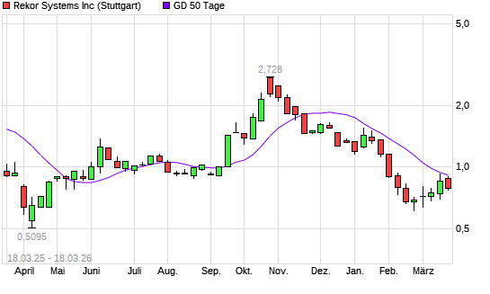 Mit dem Rücksetzer auf 0,82 EUR hat die Rekor Systems-Aktie am 17.03.2026 die 50-Tage-Linie nach unten gekreuzt.