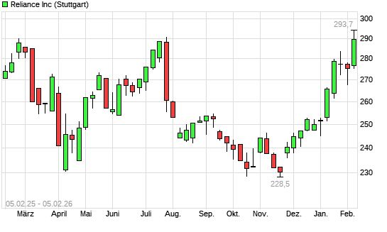 Mit dem Anstieg auf 283,00 EUR hat die Reliance Inc.-Aktie (ISIN US7595091023) am 04.02.2026 ein neues 6-Monats-Hoch erreicht und damit den Kurs vom 22.01.2026 eingestellt.