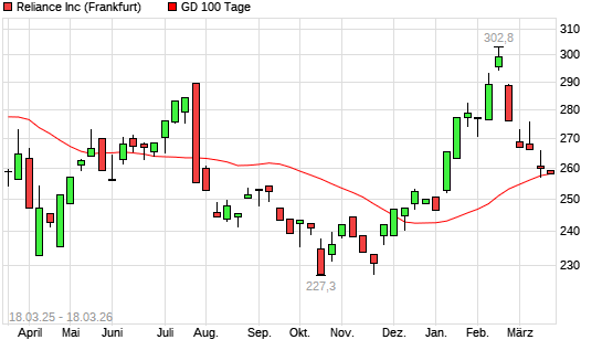 Mit dem Rücksetzer auf 258,30 EUR hat die Reliance Inc.-Aktie am 17.03.2026 die 100-Tage-Linie nach unten gekreuzt.