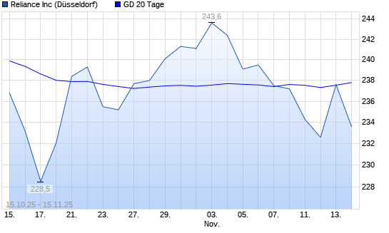 Mit dem Rücksetzer auf 233,60 EUR hat die Reliance Inc.-Aktie am 14.11.2025 die 20-Tage-Linie nach unten gekreuzt.