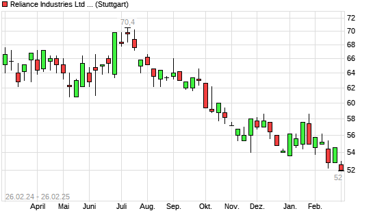 Mit dem Rücksetzer auf 52,00 EUR hat die Reliance Industries GDR-Aktie (ISIN US7594701077) am 25.02.2025 ein neues 12-Monats-Tief erreicht und damit den Kurs vom 14.02.2025 eingestellt.