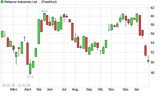 Mit dem Rücksetzer auf 50,40 EUR hat die Reliance Industries GDR-Aktie (ISIN US7594701077) am 30.01.2026 ein neues 6-Monats-Tief erreicht und damit den Kurs vom 27.01.2026 eingestellt.