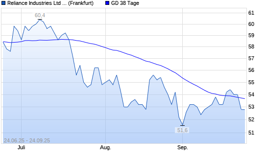 Mit dem Rücksetzer auf 52,80 EUR hat die Reliance Industries GDR-Aktie am 23.09.2025 die 38-Tage-Linie nach unten gekreuzt.