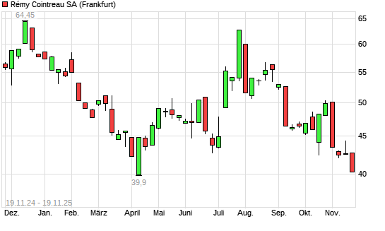 Mit dem Rücksetzer auf 41,30 EUR hat die Remy Cointreau-Aktie (ISIN FR0000130395) am 18.11.2025 ein neues 6-Monats-Tief erreicht und damit den Kurs vom 05.11.2025 eingestellt.