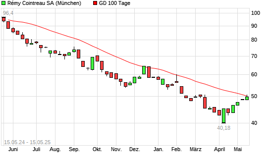 Mit dem Rücksetzer auf 49,56 EUR hat die Remy Cointreau-Aktie am 14.05.2025 die 100-Tage-Linie nach unten gekreuzt.