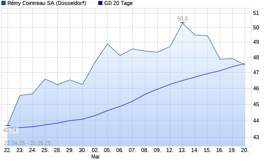 Mit dem Rücksetzer auf 47,70 EUR hat die Remy Cointreau-Aktie am 19.05.2025 die 20-Tage-Linie nach unten gekreuzt.