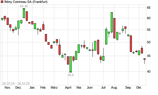 Mit dem Rücksetzer auf 42,88 EUR hat die Remy Cointreau-Aktie (ISIN FR0000130395) am 15.10.2025 ein neues 6-Monats-Tief erreicht und damit den Kurs vom 26.06.2025 eingestellt.Die Remy Cointreau-Aktie ...weiterlesen