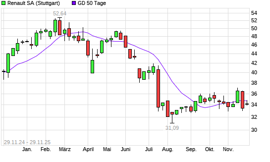 Mit dem Rücksetzer auf 34,36 EUR hat die Renault-Aktie am 28.11.2025 die 50-Tage-Linie nach unten gekreuzt.