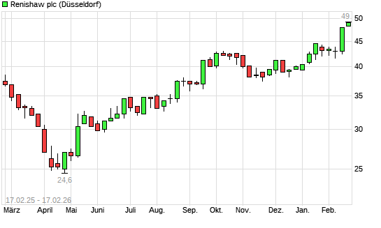 Mit dem Anstieg auf 48,20 EUR hat die Renishaw-Aktie (ISIN GB0007323586) am 16.02.2026 ein neues 12-Monats-Hoch erreicht und damit den Kurs vom 12.02.2026 eingestellt.