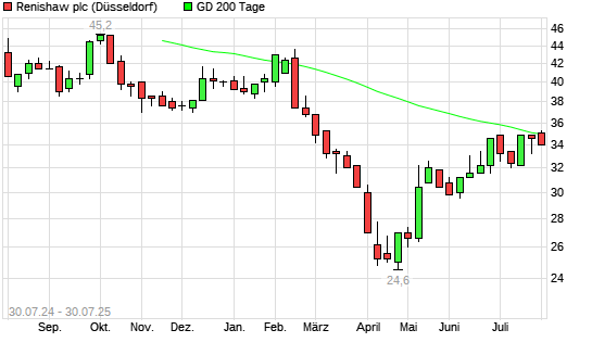 Mit dem Rücksetzer auf 34,40 EUR hat die Renishaw-Aktie am 29.07.2025 die 200-Tage-Linie nach unten gekreuzt.