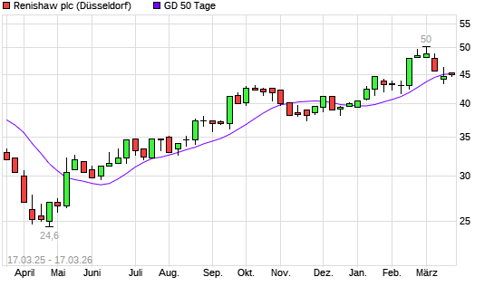 Mit dem Rücksetzer auf 45,20 EUR hat die Renishaw-Aktie am 16.03.2026 die 50-Tage-Linie nach unten gekreuzt.