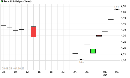 Mit dem Anstieg auf 4,45 EUR hat die Rentokil Initial-Aktie (ISIN GB00B082RF11) am 03.10.2025 ein neues 6-Monats-Hoch erreicht und damit den Kurs vom 08.09.2025 eingestellt.