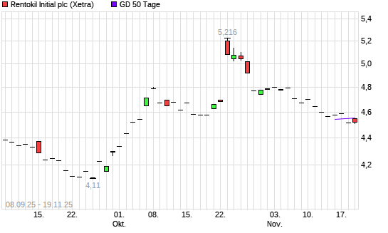 Mit dem Rücksetzer auf 4,53 EUR hat die Rentokil Initial-Aktie am 18.11.2025 die 50-Tage-Linie nach unten gekreuzt.