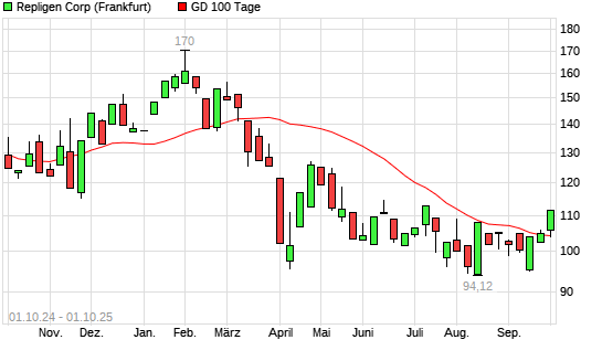 Mit dem Rücksetzer auf 104,15 EUR hat die Repligen Corporation-Aktie am 30.09.2025 die 100-Tage-Linie nach unten gekreuzt.