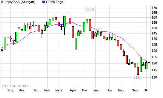 Mit dem Anstieg auf 122,30 EUR hat die Reply-Aktie am 08.10.2025 die 50-Tage-Linie nach oben gekreuzt.