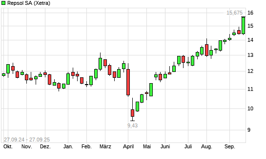 Mit dem Anstieg auf 15,68 EUR hat die Repsol-Aktie (ISIN ES0173516115) am 26.09.2025 ein neues 12-Monats-Hoch erreicht und damit den Kurs vom 25.09.2025 eingestellt.
