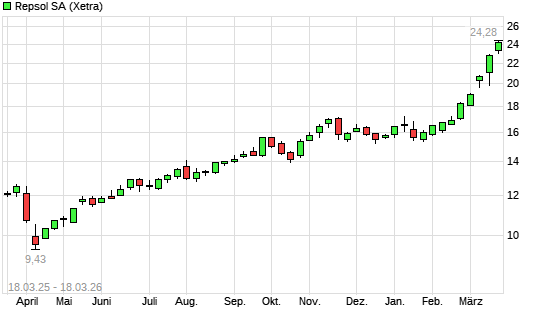 Mit dem Anstieg auf 24,68 EUR hat die Repsol-Aktie (ISIN ES0173516115) am 17.03.2026 ein neues All-Time-High erreicht und damit den Kurs vom 16.03.2026 eingestellt.