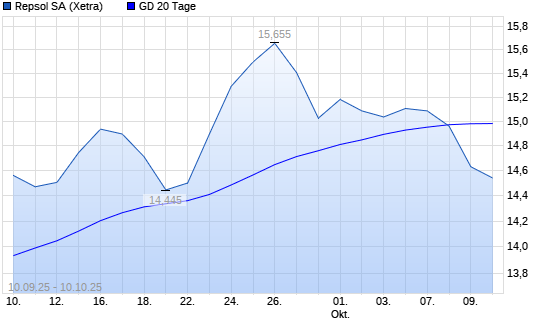 Mit dem Rücksetzer auf 14,62 EUR hat die Repsol-Aktie am 09.10.2025 die 20-Tage-Linie nach unten gekreuzt.