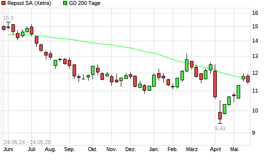Mit dem Rücksetzer auf 11,58 EUR hat die Repsol-Aktie am 23.05.2025 die 200-Tage-Linie nach unten gekreuzt.
