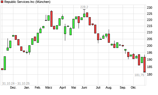 Mit dem Rücksetzer auf 180,45 EUR hat die Republic Services-Aktie (ISIN US7607591002) am 30.10.2025 ein neues 12-Monats-Tief erreicht und damit den Kurs vom 31.10.2024 eingestellt.