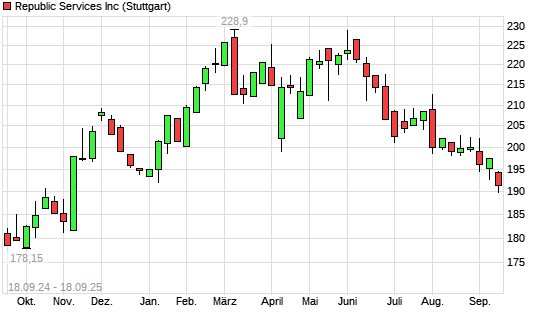 Mit dem Rücksetzer auf 189,35 EUR hat die Republic Services-Aktie (ISIN US7607591002) am 17.09.2025 ein neues 6-Monats-Tief erreicht und damit den Kurs vom 09.09.2025 eingestellt.