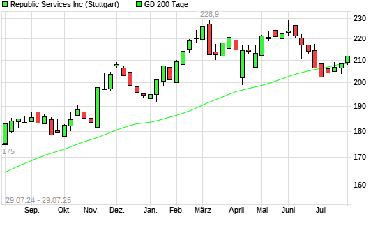 Mit dem Anstieg auf 210,80 EUR hat die Republic Services-Aktie am 28.07.2025 die 200-Tage-Linie nach oben gekreuzt.