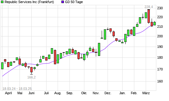Mit dem Anstieg auf 215,70 EUR hat die Republic Services-Aktie am 17.03.2025 die 50-Tage-Linie nach oben gekreuzt.