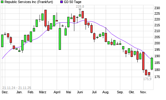 Mit dem Anstieg auf 189,35 EUR hat die Republic Services-Aktie am 20.11.2025 die 50-Tage-Linie nach oben gekreuzt.