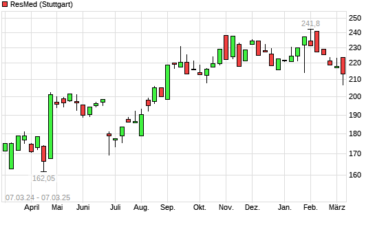Mit dem Rücksetzer auf 202,10 EUR hat die Resmed-Aktie (ISIN US7611521078) am 06.03.2025 ein neues 6-Monats-Tief erreicht und damit den Kurs vom 05.03.2025 eingestellt.