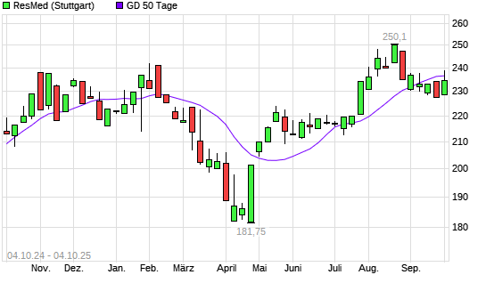 Mit dem Anstieg auf 237,10 EUR hat die Resmed-Aktie am 03.10.2025 die 50-Tage-Linie nach oben gekreuzt.