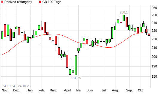 Mit dem Rücksetzer auf 228,10 EUR hat die Resmed-Aktie am 23.10.2025 die 100-Tage-Linie nach unten gekreuzt.