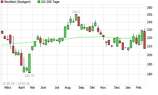 Mit dem Rücksetzer auf 213,60 EUR hat die Resmed-Aktie am 11.02.2026 die 200-Tage-Linie nach unten gekreuzt.