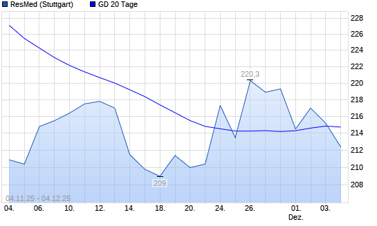 Mit dem Anstieg auf 215,00 EUR hat die Resmed-Aktie am 03.12.2025 die 20-Tage-Linie nach oben gekreuzt.Die Resmed-Aktie befindet sich seit dem 01.12.2025 im langfristigen Abwärtstrend ...weiterlesen