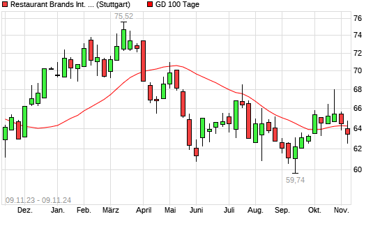 Mit dem Anstieg auf 64,50 EUR hat die Restaurant Brands International-Aktie am 08.11.2024 die 100-Tage-Linie nach oben gekreuzt.