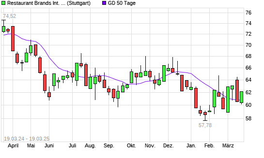 Mit dem Anstieg auf 61,52 EUR hat die Restaurant Brands International-Aktie am 18.03.2025 die 50-Tage-Linie nach oben gekreuzt.